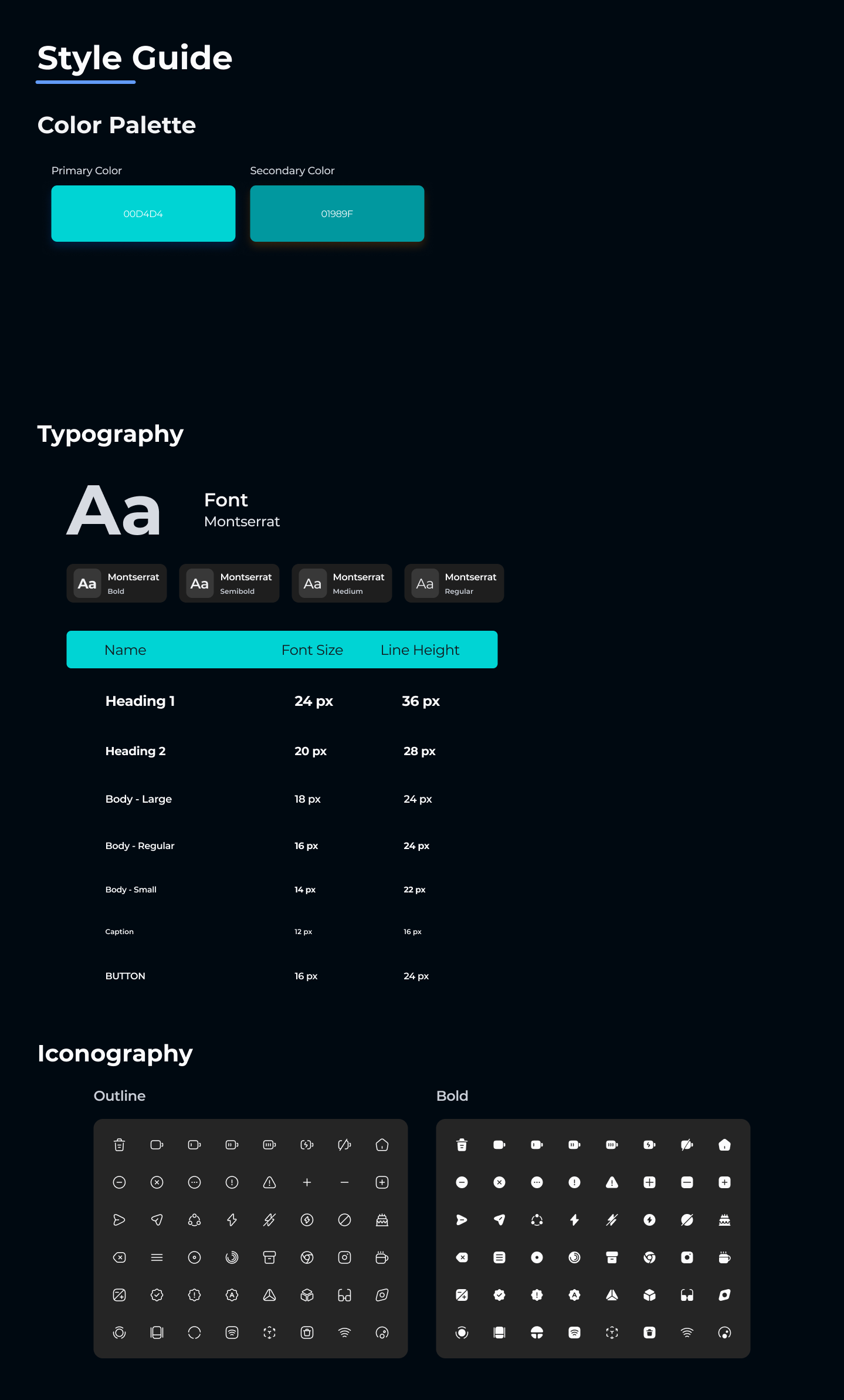 Iconography: Outline + Bold sets for clarity in navigation and actions